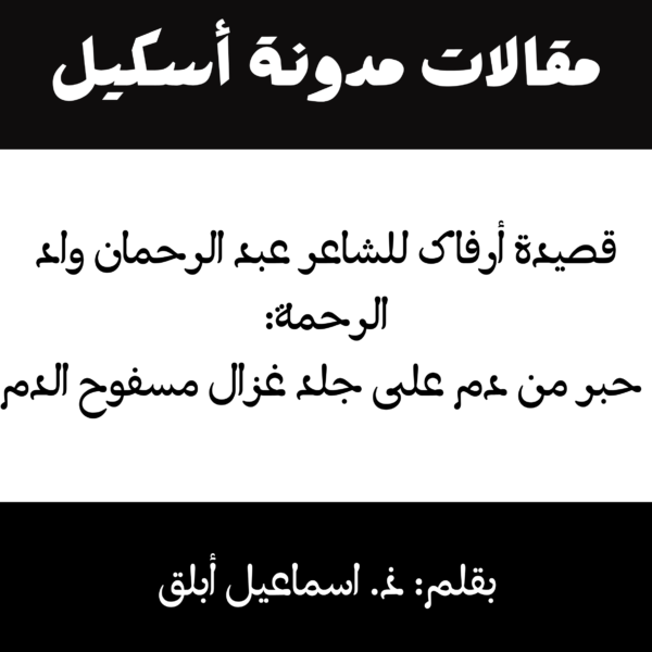 قصيدة أرفاک: حبر من دم على جلد غزال مسفوح الدمداود السوسي23 مارس، 2026قصيدة أرفاک: حبر من دم على ... اقرأ أكثر/غر ؤكَار
